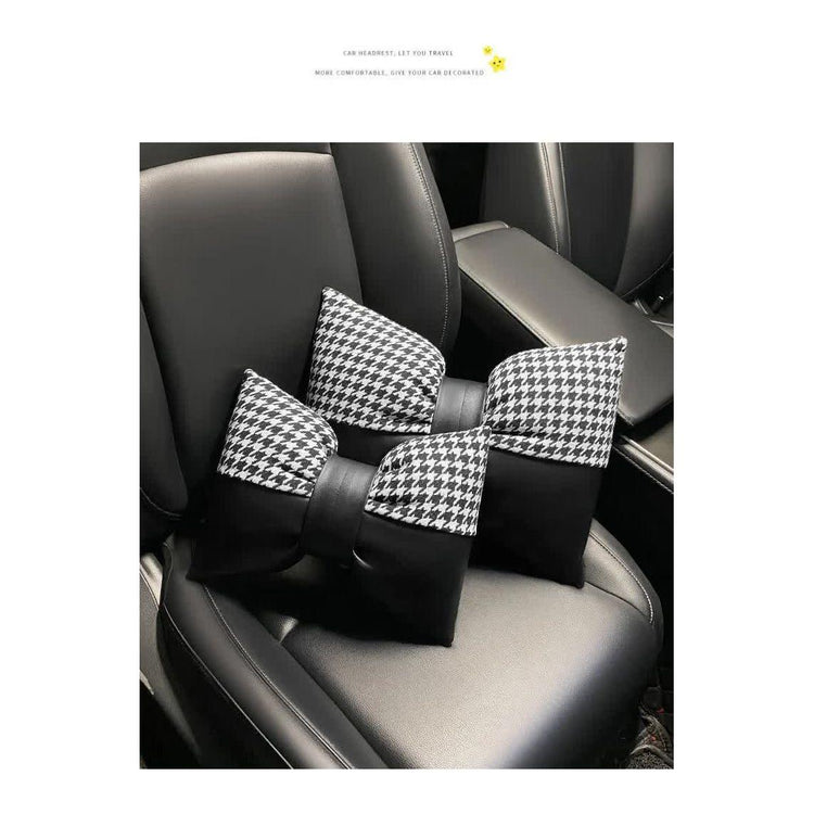 Cute Bowtie Car Headrest Pillow and Waist Cushion Set, Stylish Houndstooth Design, Soft Neck and Back Support for Car Interior