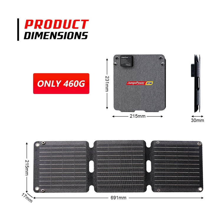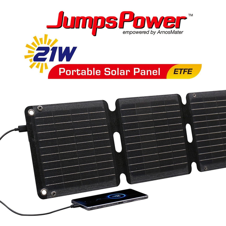 Harness the power of the sun with the JumpsPower 21W Portable Solar Panel, designed for the eco-conscious adventurer. This sleek and durable solar panel uses advanced monocrystalline silicon cells, enhanced with ETFE film for superior high-temperature and corrosion resistance, ensuring a longer lifespan and higher conversion efficiency.