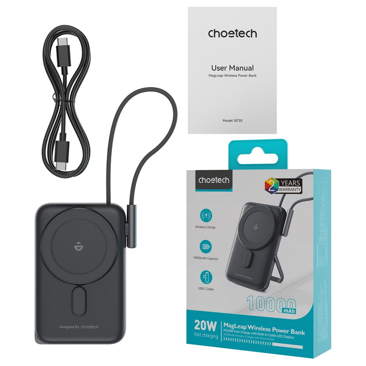 SpecificationsModel: B735 Material: aluminum alloy + ABS + PC + silicon Interface: 1 x USB-C Capacity: 10000mAh Input: 5V/2A, 9V/2A (18W) Output: USB-C 20W(Max), wireless charging 15W(Max) Size: 111 x 72 x 19.5 mm Certifications: FCC, CE, RoHS