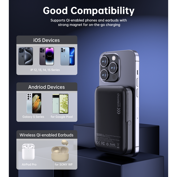 SpecificationsModel: B743 Material: ABS + PC Interface: 1 x USB-C Capacity: 10000mAh Input: 5V/2.4A, 9V/2A , 12V/1.5A (18W) Output: USB-C 20W(Max), wireless charging 15W(Max) Size: 101.5 x 72 x 21 mm Net Weight: 211g Certifications: FCC, CE, RoHS Input: 5V/2A, 9V/2A (18W) Output: USB-C 20W(Max), wireless charging 15W(Max) Size: 111 x 72 x 19.5 mm Certifications: FCC, CE, RoHS