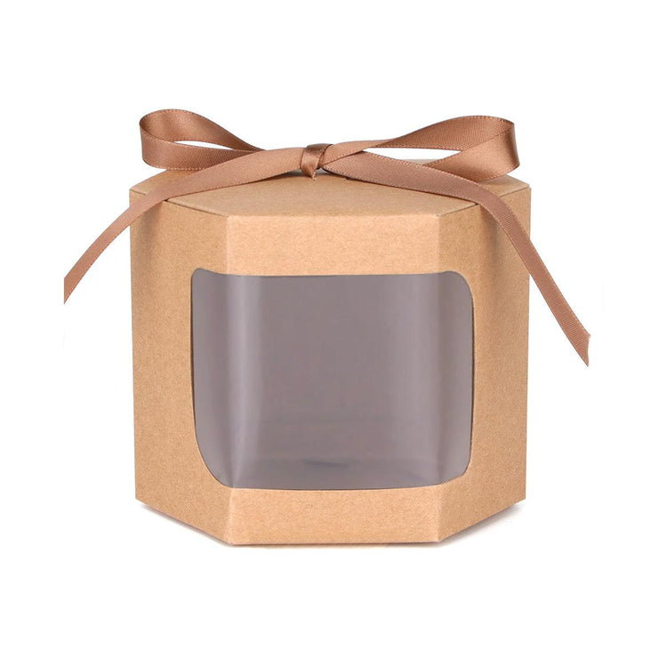 These elegant small gift boxes are perfect for packaging treats, jewellery, or small gifts. Featuring a stylish hexagonal design with a transparent window, these boxes allow for a beautiful display of contents. Crafted from thick kraft paper with a decorative ribbon, they add a touch of sophistication to any occasion. Easy to assemble and durable, they provide a secure and charming way to present gifts for parties, weddings, or other special events.