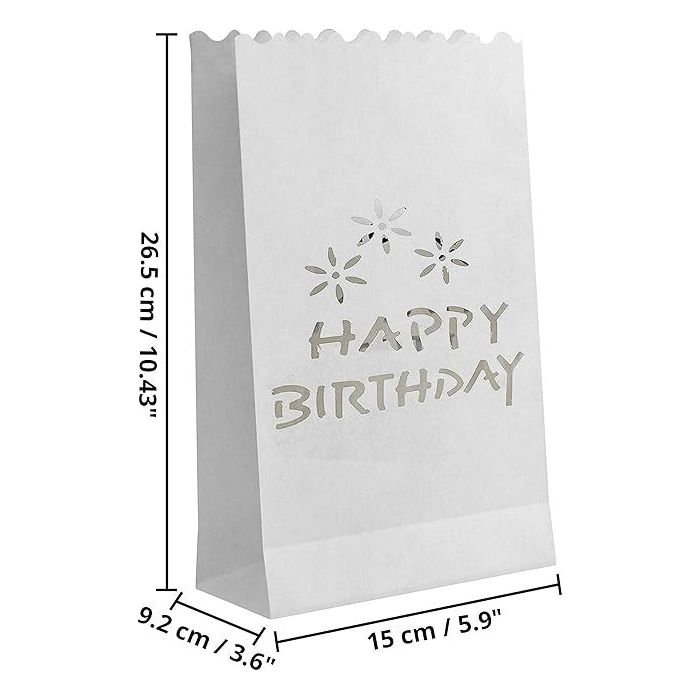 100 Pack White Happy Birthday Luminary Paper Candle Tea Light Lantern Bags Garden Anniversary Birthday Night Decorations Evening Party