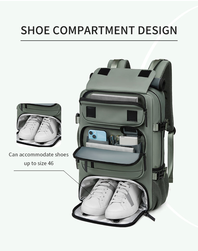 • Large Capacity & Organized Storage: Features a spacious main compartment, a padded laptop interlayer for up to a 16-inch laptop, a front storage pocket, a side pocket for a water bottle or umbrella, and an independent shoe compartment.