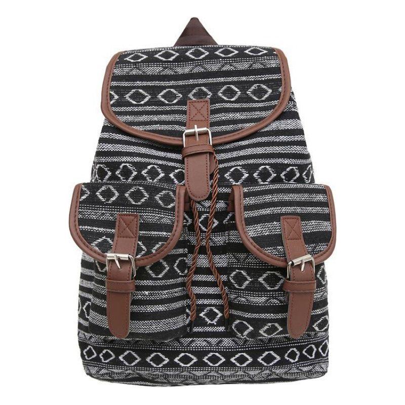 The unique ethnic pattern, combined with the durable canvas construction, makes this backpack both stylish and long-lasting. The drawstring closure and flap with buckle straps add a touch of vintage charm, while the multiple pockets provide ample space for organizing your belongings. Whether you're heading to class, exploring a new city, or attending a festival, this boho backpack is the perfect companion. It is big enough to fit everyday essentials and a book!