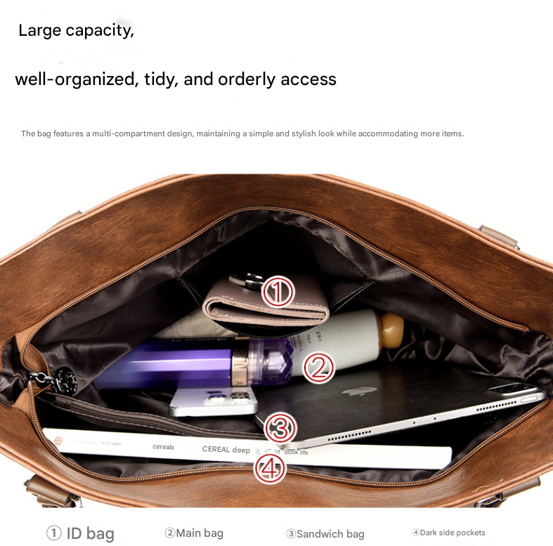 This soft PU leather tote bag offers the perfect blend of spacious capacity and chic, slouchy elegance. Featuring a distressed vintage look and multiple external zippered pockets for convenience, it is designed as an all-in-one carry solution that easily converts between a professional handbag, a practical shoulder bag, and a casual crossbody style.