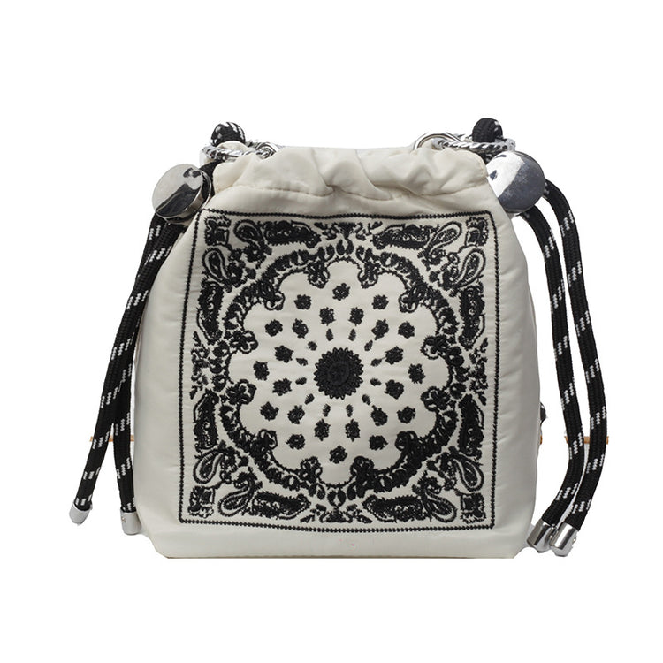 Chic Drawstring Bucket Bag with Intricate Print - Adjustable Rope Strap, Lightweight Fabric