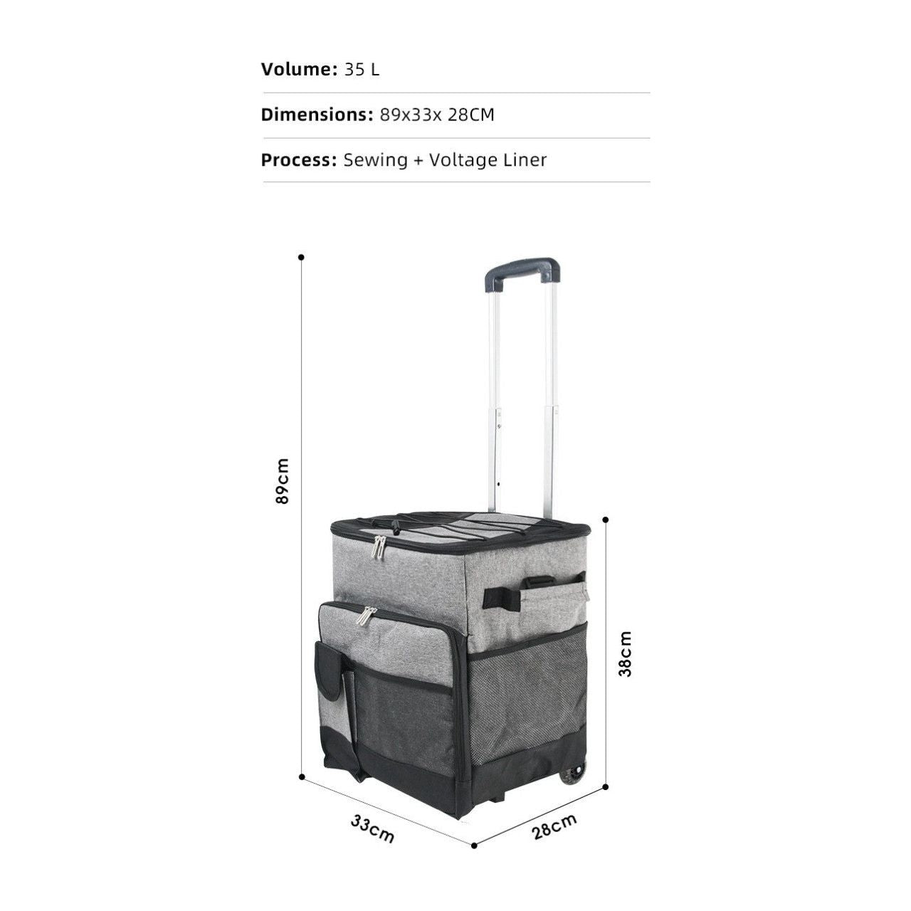 • 38cm x 33cm x 28cm - 89cm high with handle fully extended