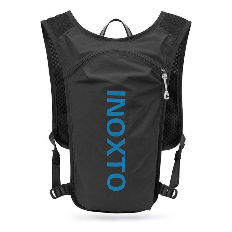 Lightweight Hydration Running Vest with 5L Capacity and Reflective Strips, Black backpack with blue text