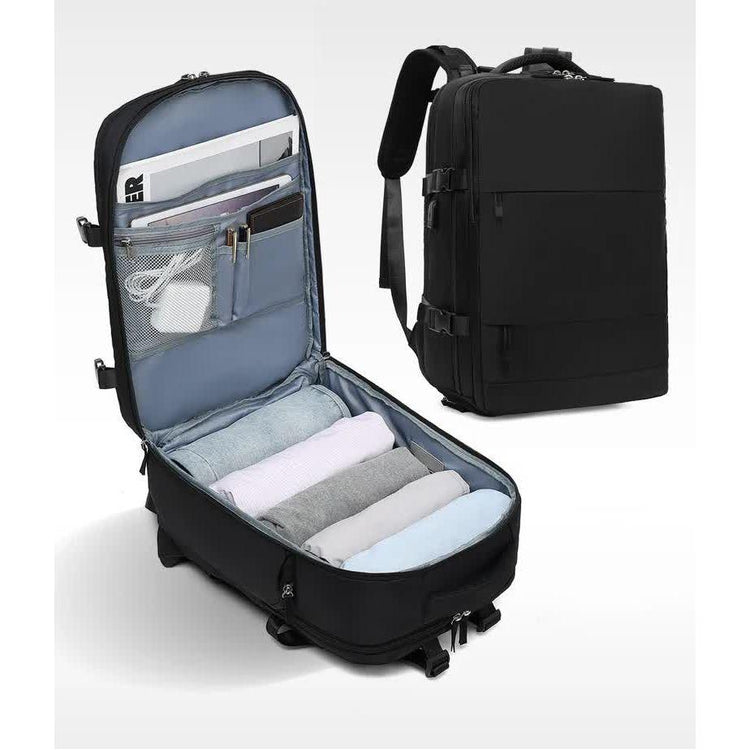 Multi-Compartment Travel Backpack with Shoe Storage - This versatile Black backpack is perfect for gym sessions, travel, or daily use. It features a unique independent shoe compartment, keeping your footwear separate from other belongings, along with wet-dry separation pockets to store damp clothes or toiletries without worrying about leaks. Designed with comfort in mind, the padded shoulder straps provide excellent support, making it ideal for long wear. A perfect combination of practicality and style for those always on the go.