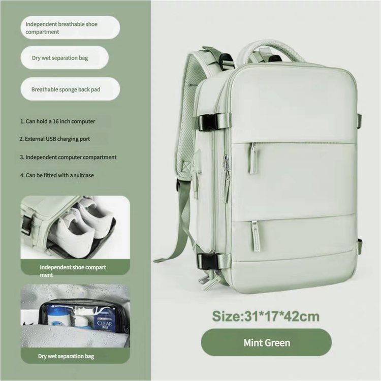 Multi-Compartment Travel Backpack with Shoe Storage - This versatile Mint Green backpack is perfect for gym sessions, travel, or daily use. It features a unique independent shoe compartment, keeping your footwear separate from other belongings, along with wet-dry separation pockets to store damp clothes or toiletries without worrying about leaks. Designed with comfort in mind, the padded shoulder straps provide excellent support, making it ideal for long wear. A perfect combination of practicality and style for those always on the go.