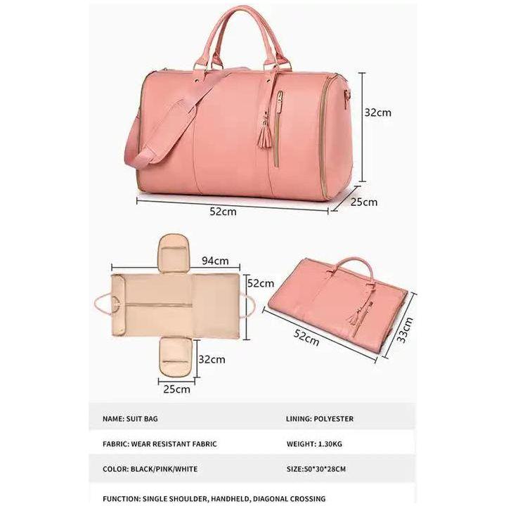 Pink PU Leather Foldable Garment Bag, Women's Travel Duffel with Suit Carrier, Multi-Function Storage
