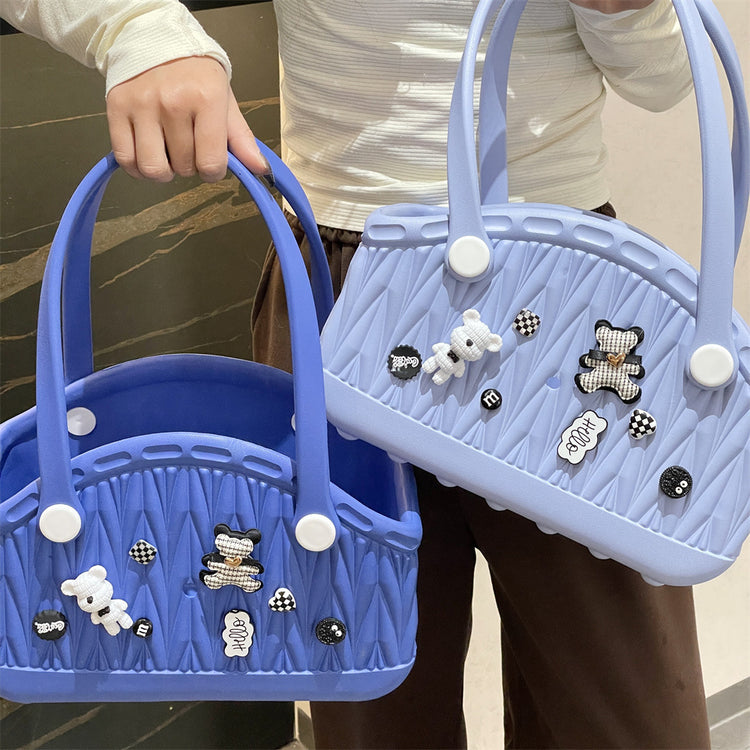 This handbag is designed for style and functionality. It has a roomy interior to hold your daily essentials. It features charming decorative elements, adding a fashionable touch. The handbag is made from durable materials, ensuring it can be used regularly. It has sturdy handles for easy carrying.