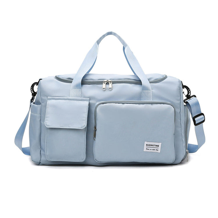 • This all-in-one gym and travel duffle bag is designed with dimensions of 50 x 28 x 21cm and features a total of 7 pockets. It includes a spacious main pocket, a dedicated shoe compartment, 4 exterior pockets, and a convenient wet pocket for storing wet clothes, toiletries, or towels. Stay organized and keep all your essentials in one place.