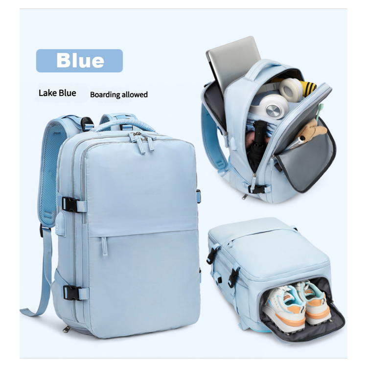 Water-Resistant Laptop Backpack with USB Charging Port - Stay organized and connected on the go with this sleek blue laptop backpack. Designed for modern professionals, it features a dedicated laptop compartment that fits up to 15.6-inch laptops, wet-dry separation pockets for clothes or toiletries, and an external USB charging port to power your devices anywhere. The ergonomic design includes breathable memory foam padding for comfortable wear, making it perfect for work, travel, or daily use.