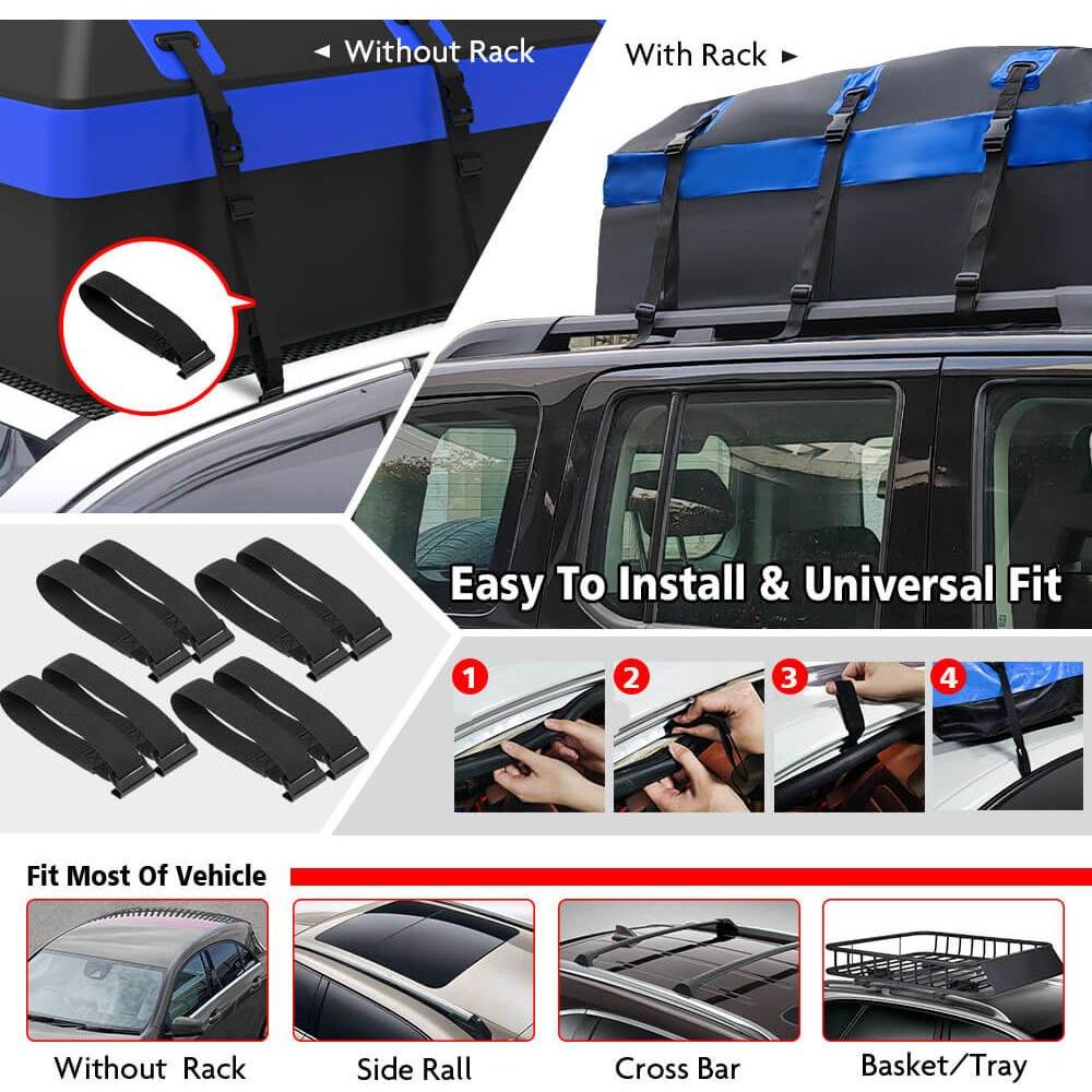 -- 100% Waterproof rooftop cargo bag with 425L of space.