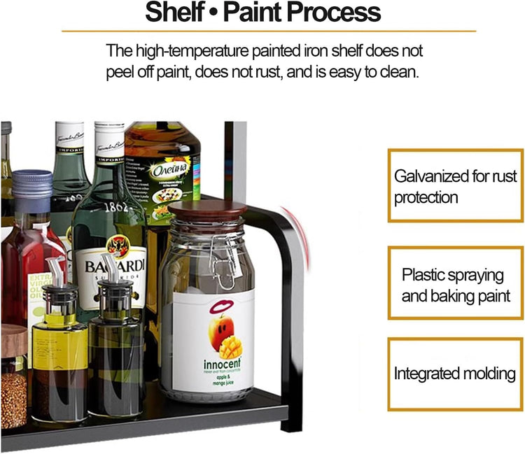 - PREMIUM MATERIAL & STABLE DESIGN: Built with thick natural wood shelves and a durable black metal frame, this 2-tier kitchen rack offers excellent stability and long-lasting performance. Non-slip foot pads add extra grip and protect your surfaces.