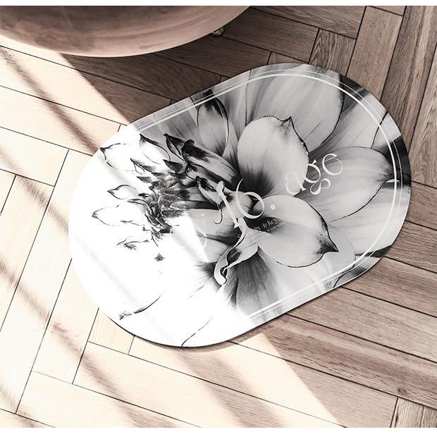 Enhance your home with this Elegant Floral Print Absorbent Floor Mat, perfect for bathrooms, entryways, or any area prone to moisture. This beautifully designed oval mat features intricate floral patterns and a sophisticated border with text. Crafted with a textured, leather-like surface, it offers a comfortable foot feel that isn't cold even in winter and is easy to clean. The mat boasts excellent water absorption capabilities, quickly wicking away moisture to keep your floors dry and safe. Its non-slip backing ensures it stays securely in place, providing added safety. Add a touch of elegance and practicality to your living space with this stylish and functional floor mat.