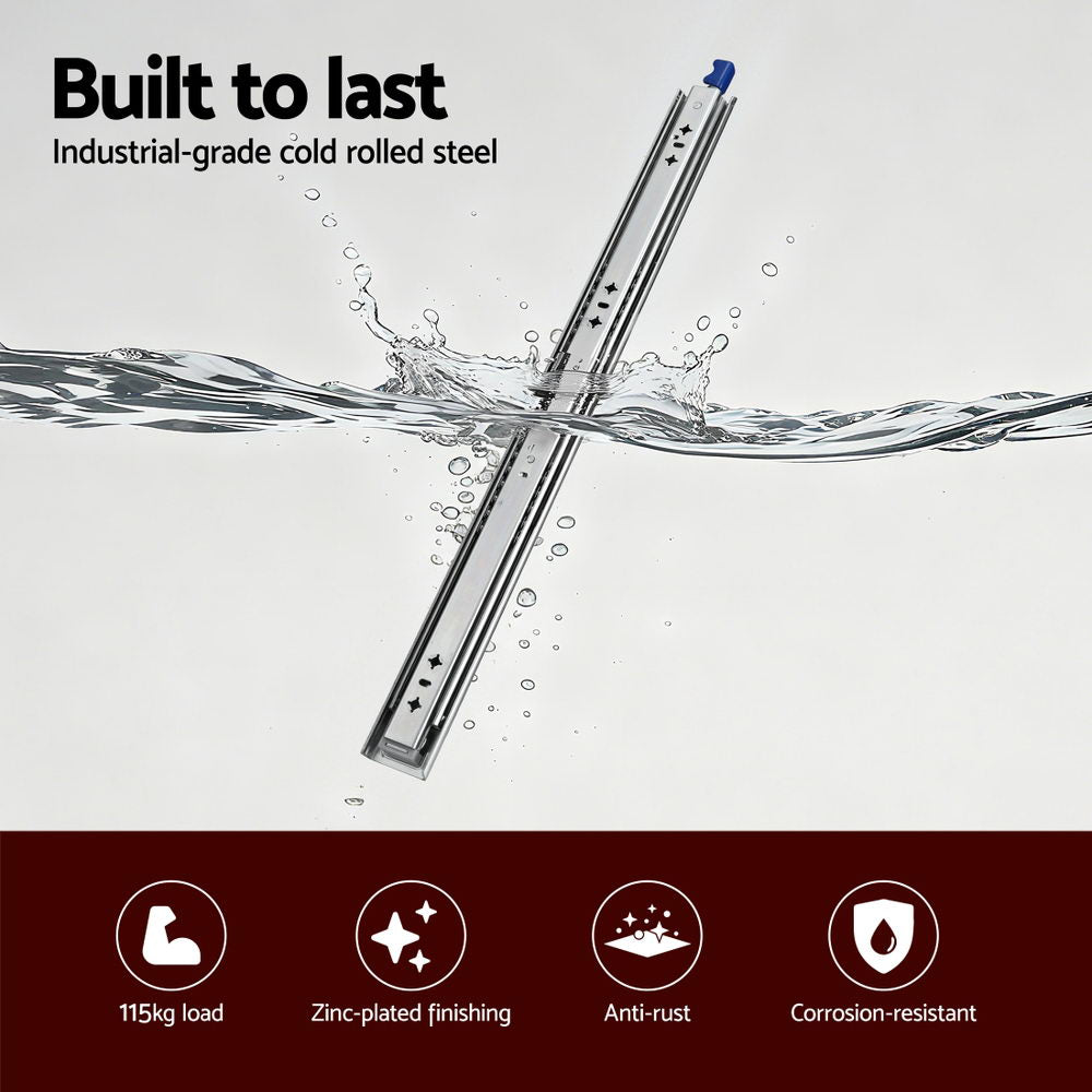 Enhance your storage setup with the Giantz Heavy-Duty Drawer Slides, engineered for superior performance and durability. Available in a range of lengths from 600mm to 1200mm, these slides can handle a substantial load of up to 115kg, making them perfect for your toughest projects. Whether it's a UTE toolbox, a camper trailer's storage, or a 4WD cargo system, or household cabinets, these slides provide reliable support. Experience effortless operation with the precision ball bearings, ensuring a smooth and silent glide every time. The integrated nylon buffer design offers a soft and quiet close, while the optimized PP triggers make locking and unlocking simple and safe. Built from thickened zinc-coated cold-rolled steel, these slides are designed for a long lifespan, capable of withstanding over 50,000 opening and closing cycles. The lock-in/lock-out design ensures your drawers stay securely in place on uneven ground. With full extension, you can easily access items at the very back of your drawer, maximising your storage and convenience. Upgrade your drawers with Giantz and enjoy a combination of strength, safety, and smooth functionality.