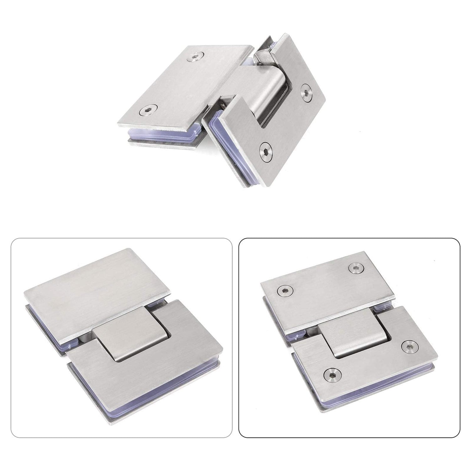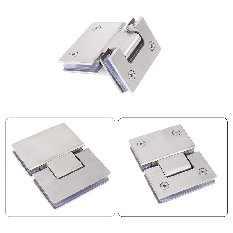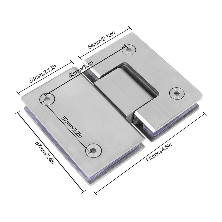Premium Material: The door hinges are made of high-quality 304 stainless steel with satin nickel finishing. With 4mm thickness, the frameless glass door hinges can be sturdy and durable for years, ensuring long-time use without any deformation, scratch or abrasion.