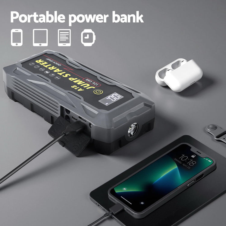 If you're looking for a simple, safe way to bring your vehicle back to life, our Portable Car Jump Starter is the only tool you need in your glove box. Instantly jump-start dead batteries with 2000 amps of peak lithium power, getting you back on the road in seconds. Engineered with ultra-safe smart clamps, this device features patented spark-proof and reverse polarity protection, ensuring a foolproof connection to any 12V vehicle. More than just a jump starter, it's an all-in-one power solution: the integrated QC3.0 power bank provides emergency power for your smartphone and other devices, while the built-in 400-lumen LED flashlight offers three light modes for roadside emergencies. Built tough with an IP66 waterproof rating and a compact, portable design, this jump starter delivers exceptional performance and long-lasting reliability, ensuring you're always prepared for the unexpected. Get yours today and drive with peace of mind.