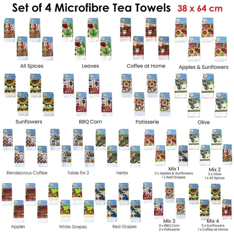 This Set of 4 Microfibre Printed Tea Towels 38 x 64 cm is your best buddy for kitchen cleaning and drying needs. Have the better sop up water and decontamination breathe freely is better, easy to desiccation, almoset unable bacilli. The design features household items, fruits, plants and flowers in lovely colour tones that will easily match with kitchen decor. It is made from quality and easy care microfiber.