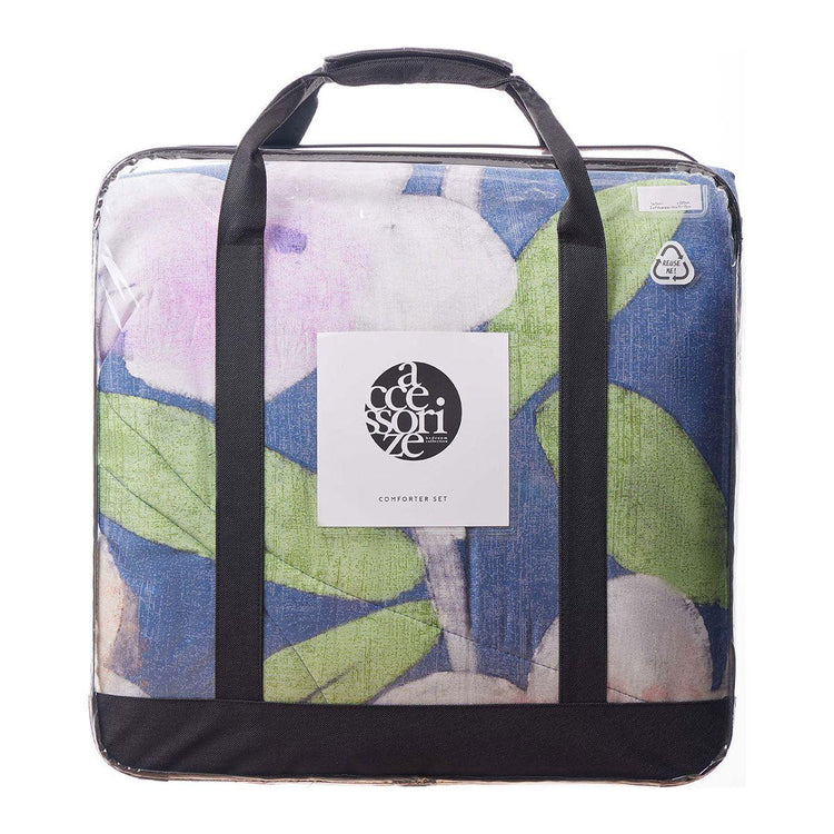 The Bella Blue Floral 3 Piece Comforter Set by Accessorize brings a touch of elegance and charm to your bedroom. Featuring a stunning floral design with soft, watercolour-like hues of blue, white, black, green, red, purple, and yellow, this set adds a fresh and inviting feel to your space. The comforter is made from plush, breathable fabric for year-round comfort, while the matching pillowcases complete the coordinated look. With its blend of contemporary and nature-inspired aesthetics, this set effortlessly enhances any modern or classic decor.