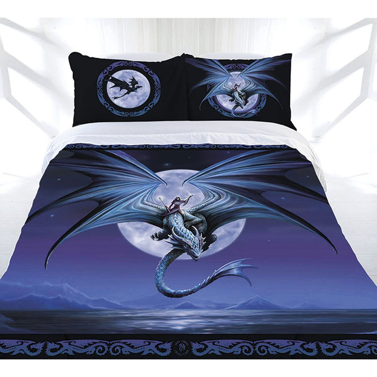 This Moonstone Quilt Cover Set by Anne Stokes is a perfect way to incorporate a Gothic-style bedroom. This stunning design features a print design of a flying dragon with wings span across the sky and a wizard riding on its back with a large luminescent full moon on the background. The graphic is printed in white, blue, black, purple, and grey colour tones. It is made from quality and soft feel Polyester Cotton fabric.