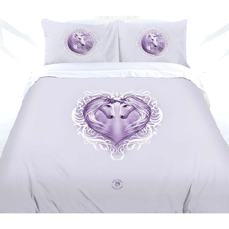 Bring love into your bedroom with this beautifully crafted White Unicorn Quilt Cover Set by Anne Stokes. It features print design of two gorgeous unicorn heads forming a romantic heart that depicts eternal love printed in white, purple, lilac, and pink colour shades that make your bedroom unique and attractive. It is made from Polyester Cotton fabric that is easy care and smooth to the skin.