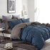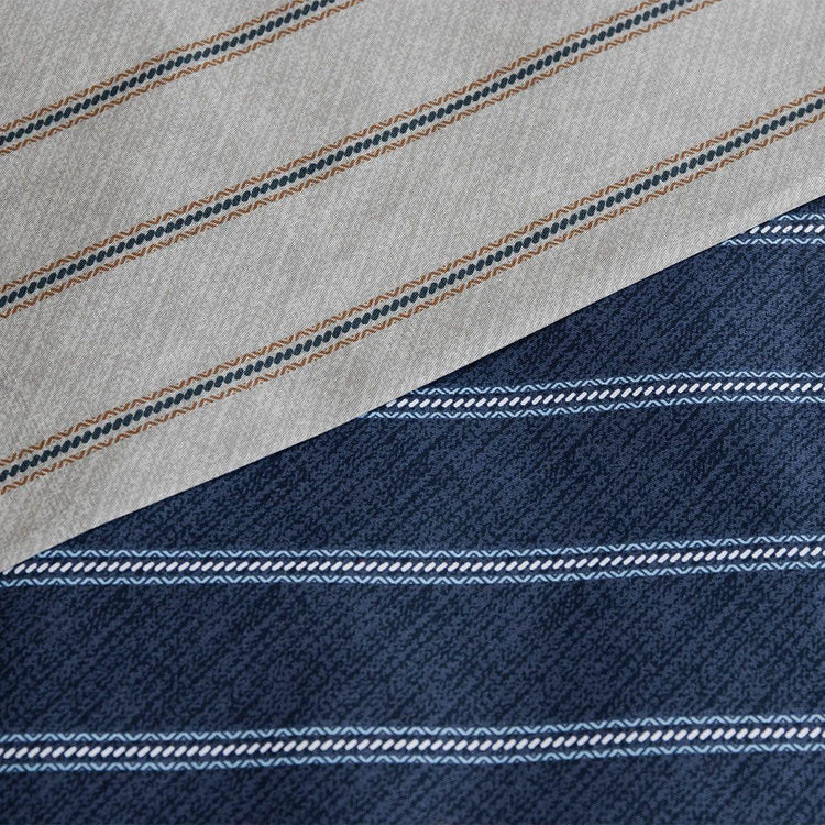 The 250TC Oliver Stripes Cotton Sateen Quilt Cover Set by Ardor in deep navy, white, blue, and charcoal, layers textural grey stripes to create a subtle pattern. This design adds depth and sophistication to your space, with it's understated textures and soothing grey reverse.