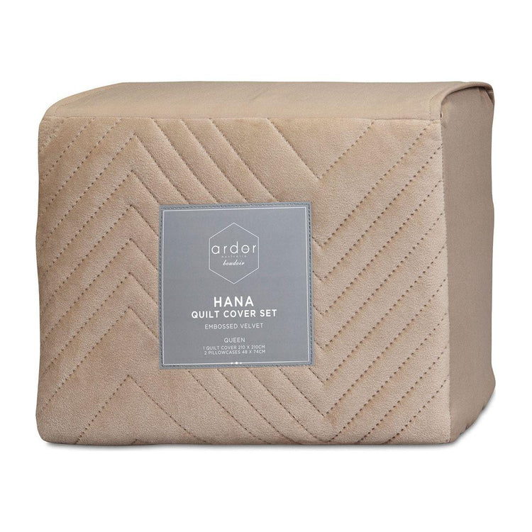 Elevate your bedroom decor to modern sophistication with the Hana Champagne Embossed Velvet Quilted Quilt Cover Set by Ardor. Featuring a luxurious chevron embossed velvet front with a plain dyed reverse. It is made from quality and easy care polyester fabric for long-lasting use.