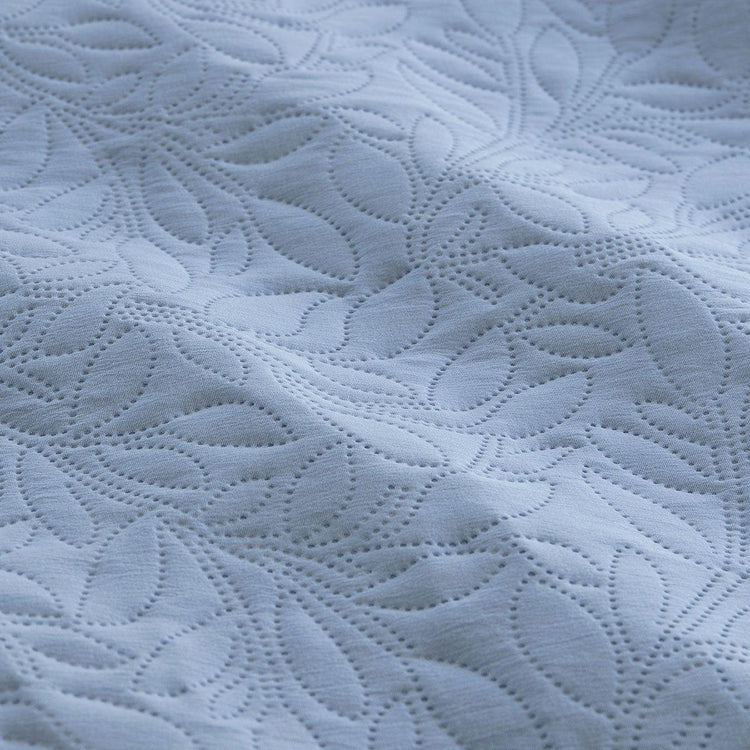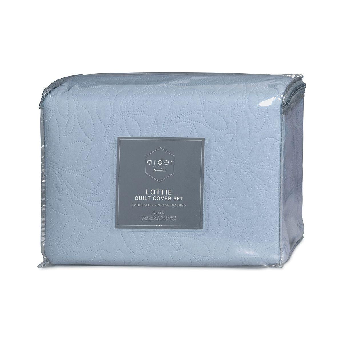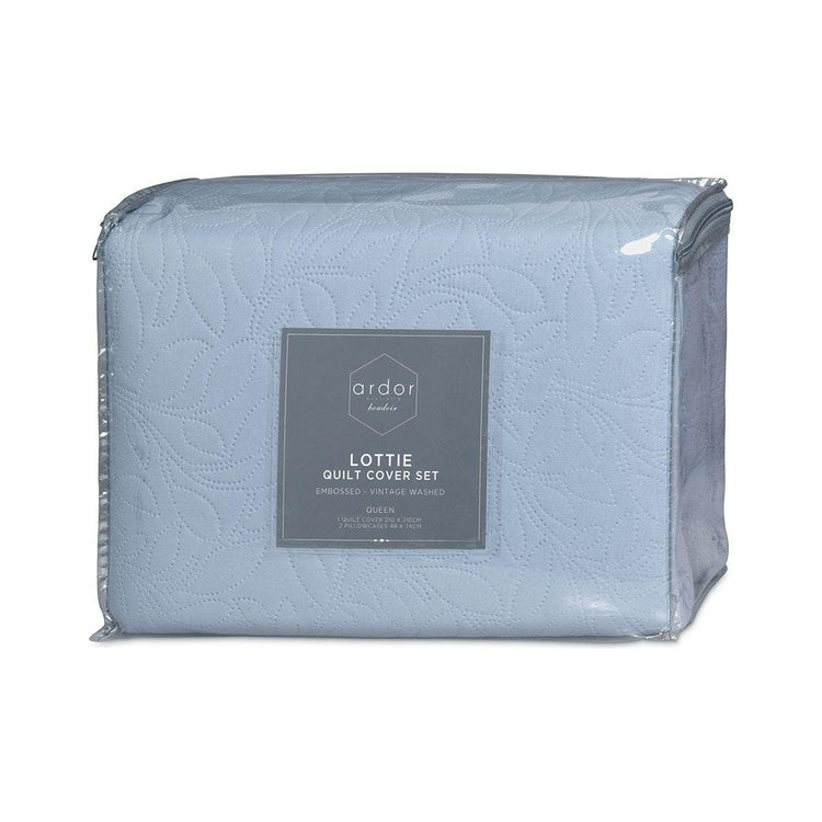The Lottie Bluebell Pinsonic Embossed Quilt Cover Set by Ardor inspires a feminine style. The trailing foliage embossed pattern on soft fabric, is available in Blush or Blue Bell hues; Lottie is a great way to add finer details to your bedroom. It is made from quality and soft touch microfibre fabric for a relaxing and cosy night's sleep.