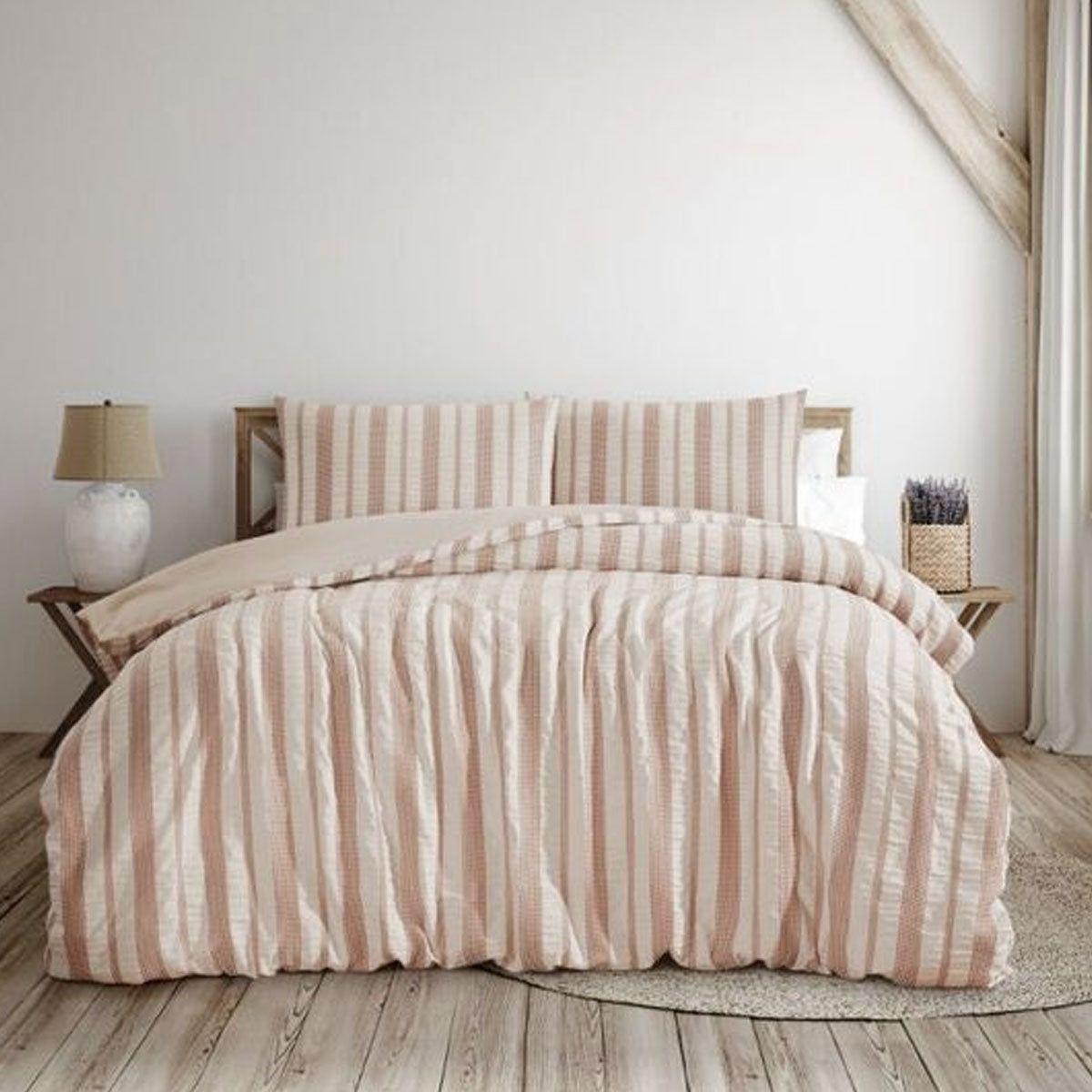 Make your bedroom more calming and inviting with this classy Seersucker Quilt Cover Set Lisbon Shell by Ardor. Lisbon's vintage textural detail of seersucker paired with a waffle weave creates a detailed linear pattern on the front of this quilt cover set, hinting notes of elegance with a subtle shell and natural colours, with a plain dyed reverse. Lisbon is a necessary staple to your bedroom decor. It is made from quality and soft touch Polyester fabric for that perfect relaxation you need.