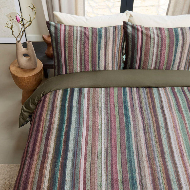 The Roman Multi Cotton Stripe Quilt Cover Set by Bedding House comprises a stunning stripe print in faded shades of pink, sage, white, burgundy, grey, purple, and taupe. The vertical stripes are painted with watercolours, creating lots of colour nuances and overlays. The duvet cover background has a woollen fabric texture. The backside of the duvet cover is uni-dyed olive green. The duvet cover's satin weave feels delightfully soft to the touch and has a sophisticated sheen.
