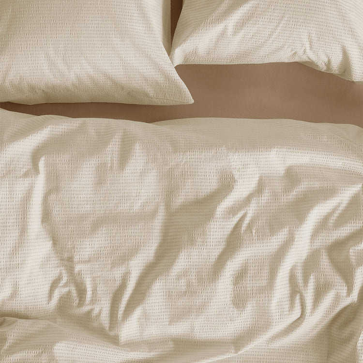 Are you looking for a nice basic comforter cover for your bedroom? Then the Summer Sand Seersucker Cotton Quilt Cover Set by Bedding House. A simple design, but a beautiful look. Summer comes in Sand seersucker fabric, a thin wrinkled fabric. The fabric is loosely woven with a very fine yarn. The fabric is light and breathable and due to its strong moisture absorbing and good ventilating ability, the comforter cover makes you feel comfortable. Also, the quilt cover feels wonderfully soft and supple around the body