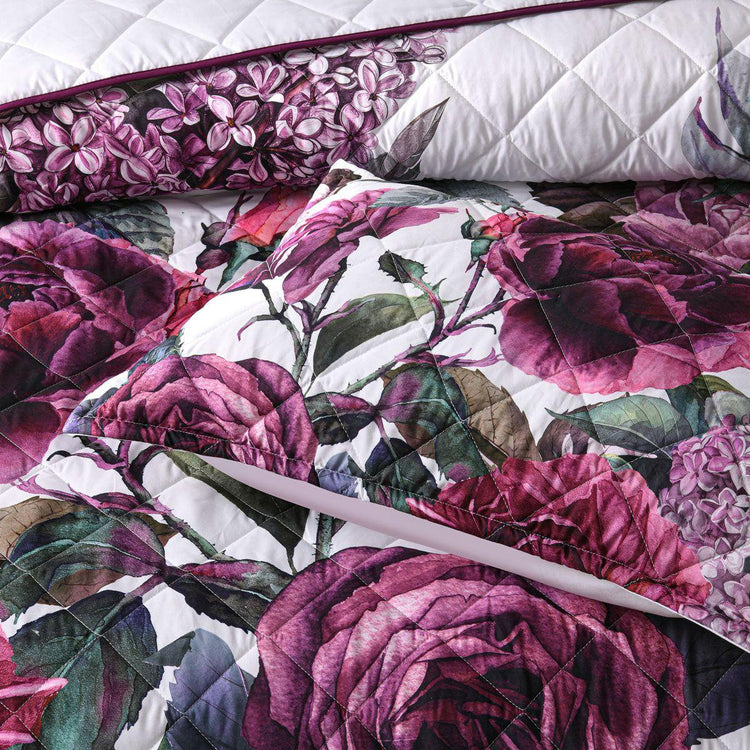 Stunning, bold florals alongside gorgeous foliage in deep berry, white, green, purple, grey, and black colour tones. Abigail Berry Floral Printed Quilted Bedspread Set by Bianca, featuring a beautiful diamond quilting pattern and finished with an elegant piped edge in the plum to complement the floral design. Complete the look with matching accessories.