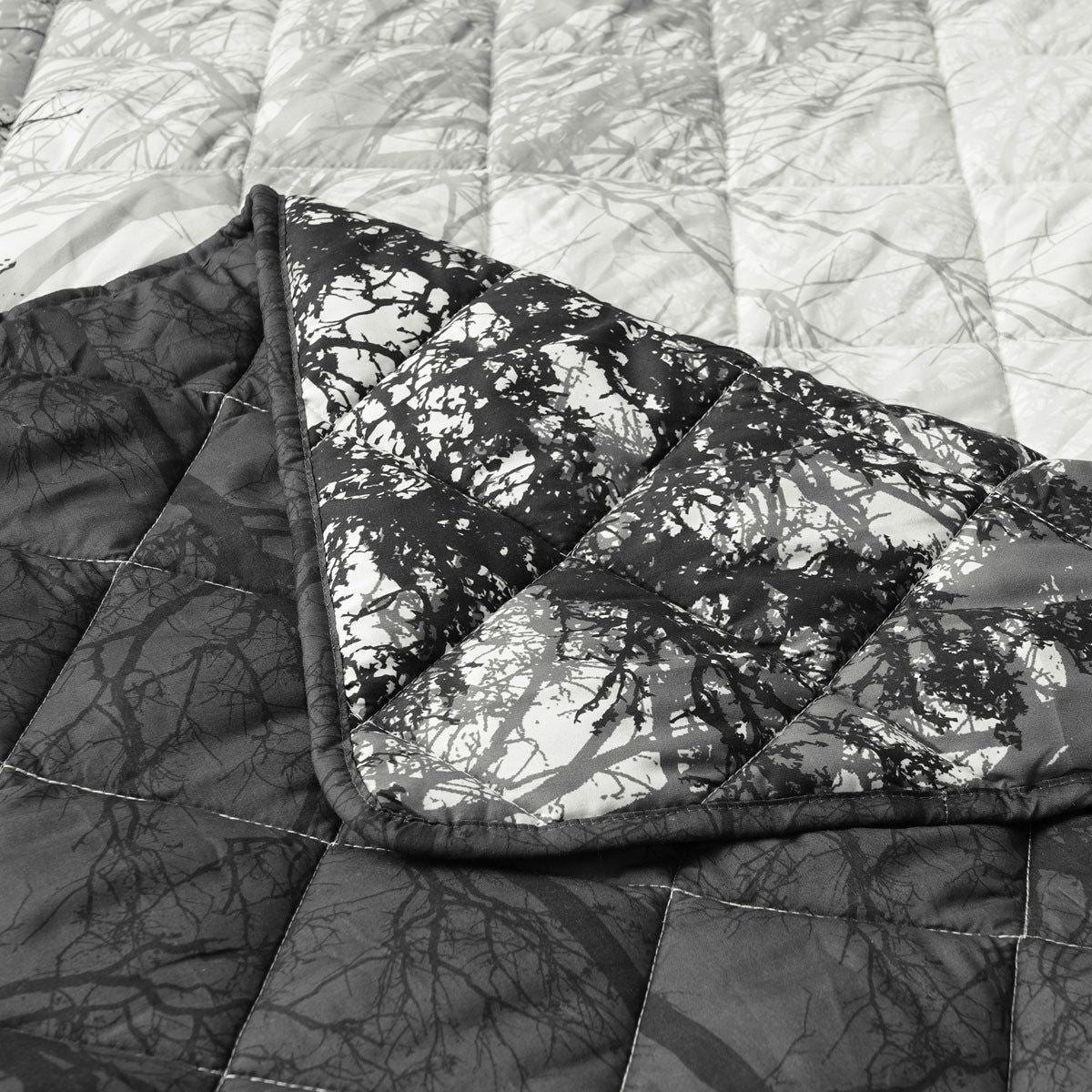 A mystifying forest. Making you want to dive deeper in and amongst the trees. Boscage Black Forest Printed Quilted Polyester Coverlet Set by Bianca adds a touch of sophistication with beautiful neutral tones of black, white, and grey hues and a contrasting black reverse. A classy diamond quilting pattern elevates this design.