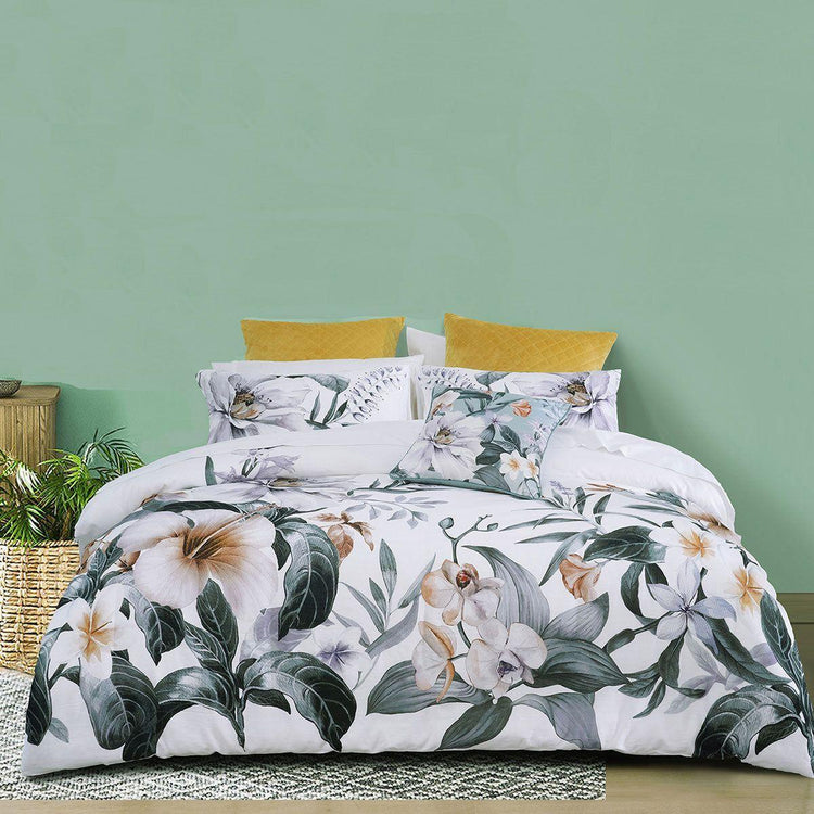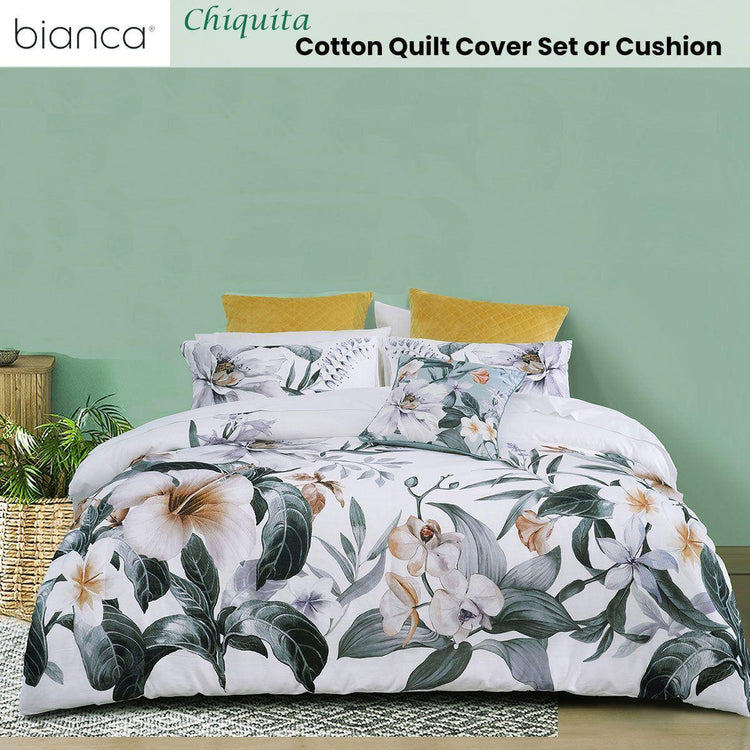 Printed on a gorgeous linen look cotton fabric, this beautiful floral design Chiquita Cotton Quilt Cover Set by Bianca features stunning white, green, cream, yellow, lilac, teal, grey, and peach tones that are depicted in the leaves which are scattered across the bed. Add the coordinate printed velvet cushion to complete the look.