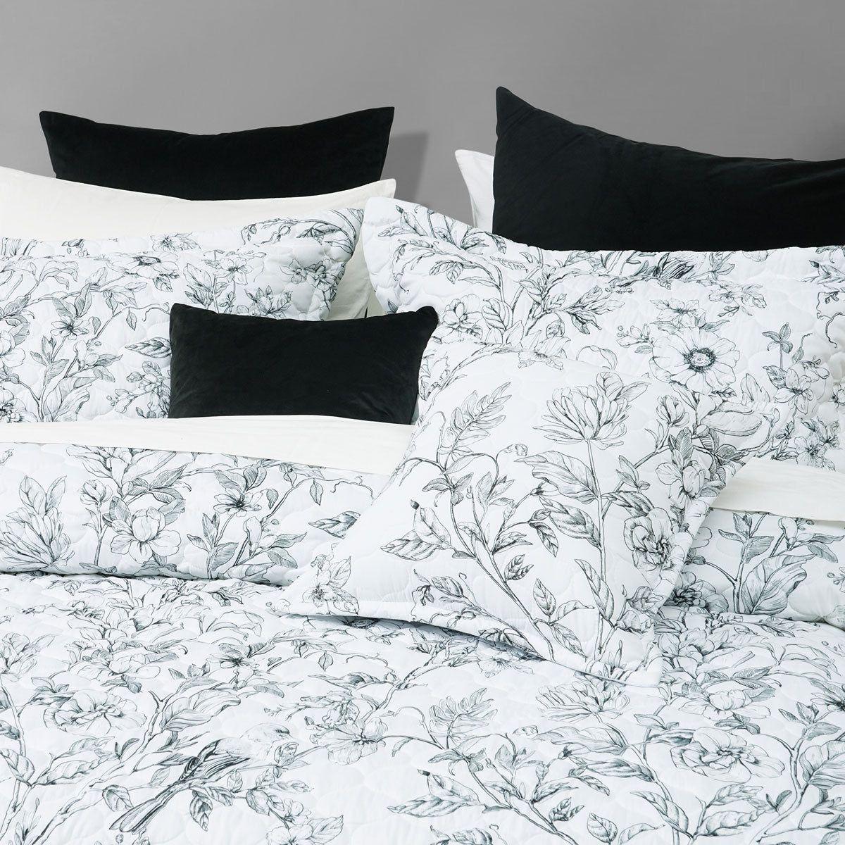 This delicate and timeless design transports you to the fresh countryside. Contrasted on a fresh white background, stunning floral outlines in black and grey cascades over the entire bed. Completed with a beautiful, sophisticated tailored edging, Gracie White Floral Printed Quilted Bedspread Set by Bianca is the perfect bedspread for your boudoir. Complete the look with matching accessories.