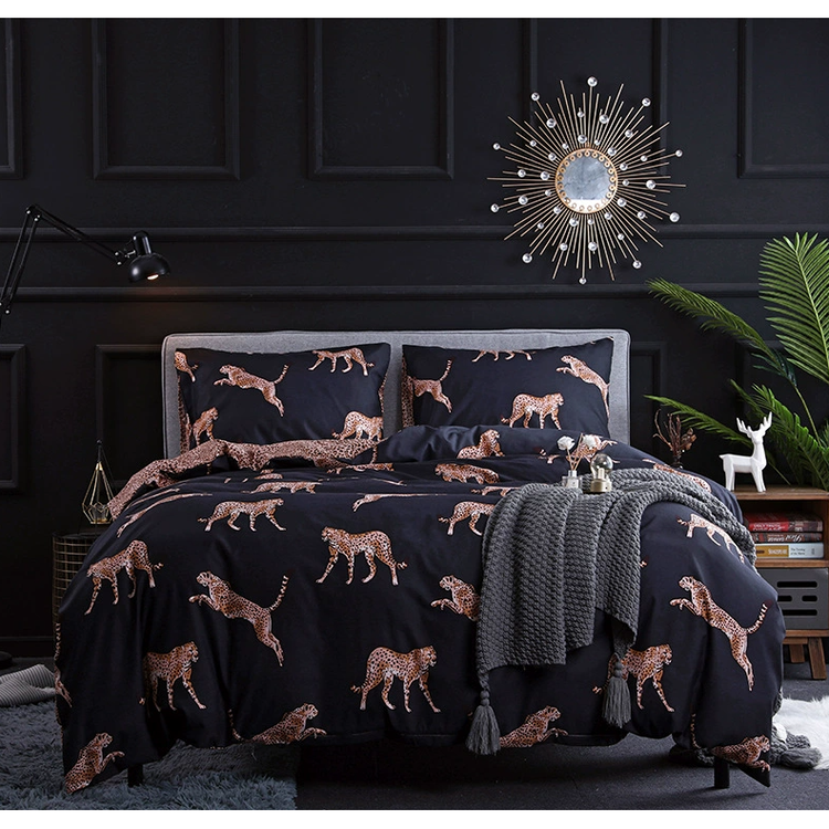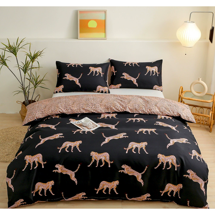 Black leopard print Three-Piece Bedding Set - Comfortable Polyester with Adjustable Corner Straps (Quilt Cover 173*230CM + Pillowcase 51*76CM*2)
