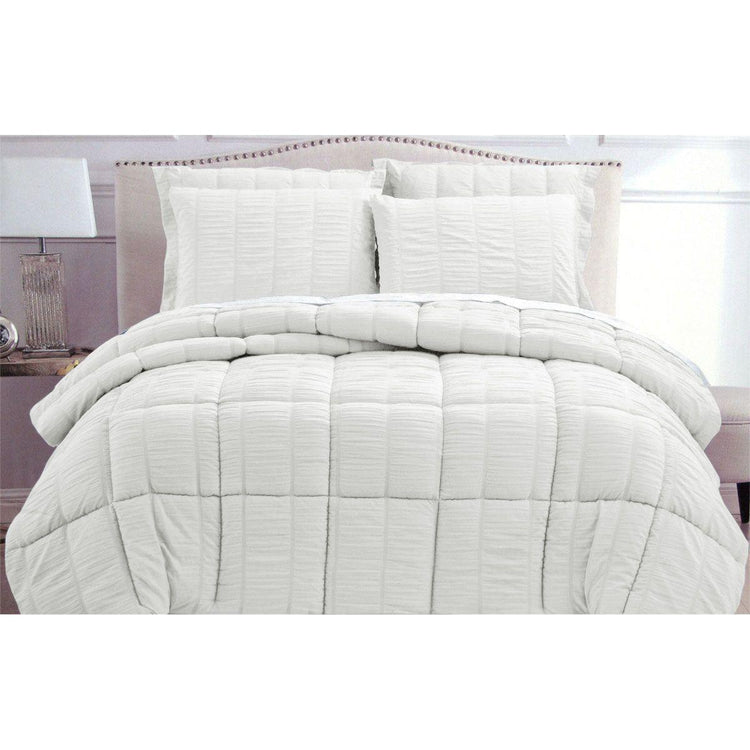 Ultra soft fabric with just the right amount of warm and comfort is what you get from this 3 Piece Seersucker Comforter Set White by Hotel Living. It features a unique seersucker design and square quilted pattern in clean colour hue that adds a touch of freshness to your bedroom atmosphere. It is made from durable and soft touch microfiber and microfiber filling that will bring ultimate comfort and warmth you can enjoy all night long.