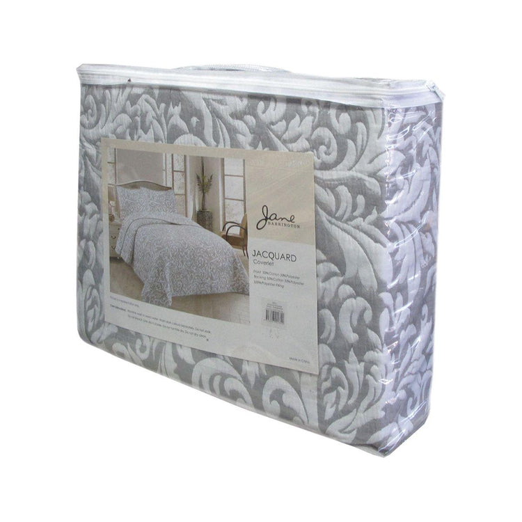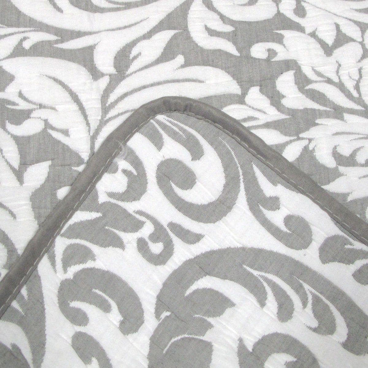 Indulge in timeless elegance with the Grey & White Lightly Quilted Jacquard Reversible Coverlet Set by Jane Barrington. This soft bedding ensemble features a foliage jacquard motif in shades of white and grey, adding a touch of sophisticated charm to your bedroom. Made from polyester cotton fabric and polyester filling that offer year-round comfort. Curl up under the plush comfort of this coverlet set and personalize your sleep haven and create a calming atmosphere night after night.
