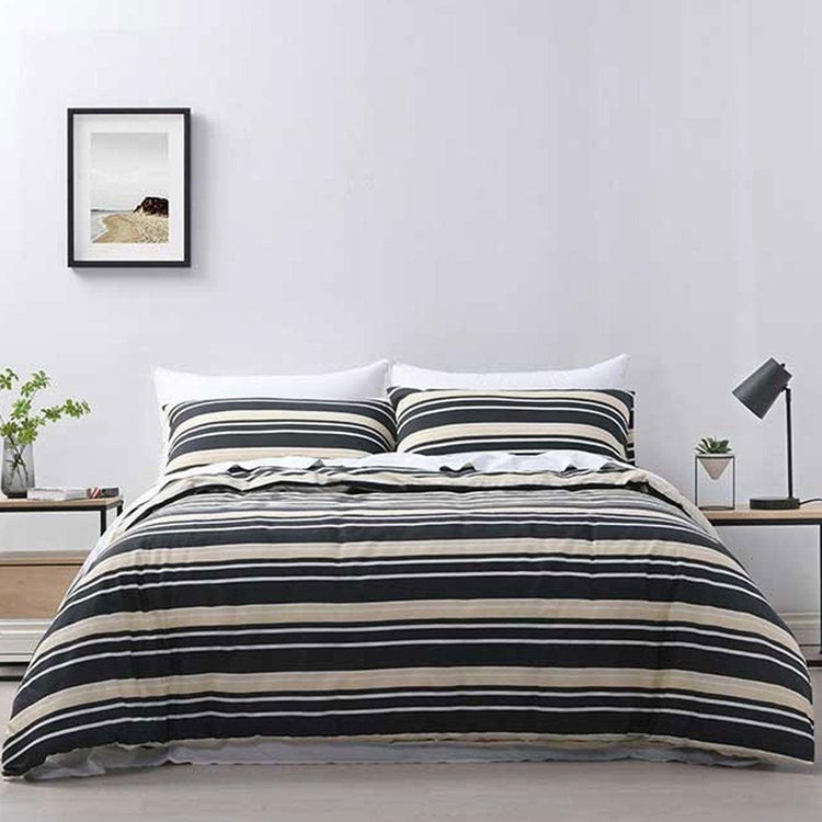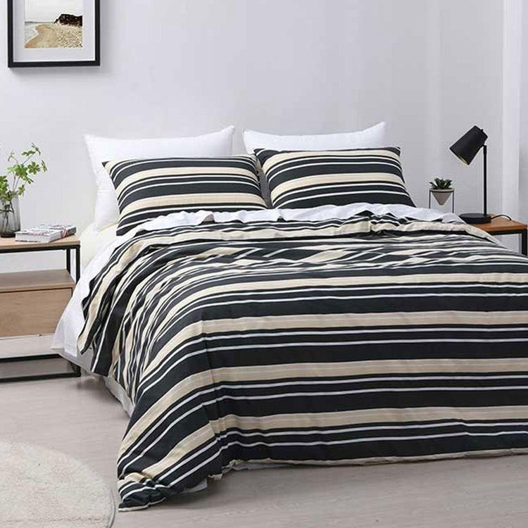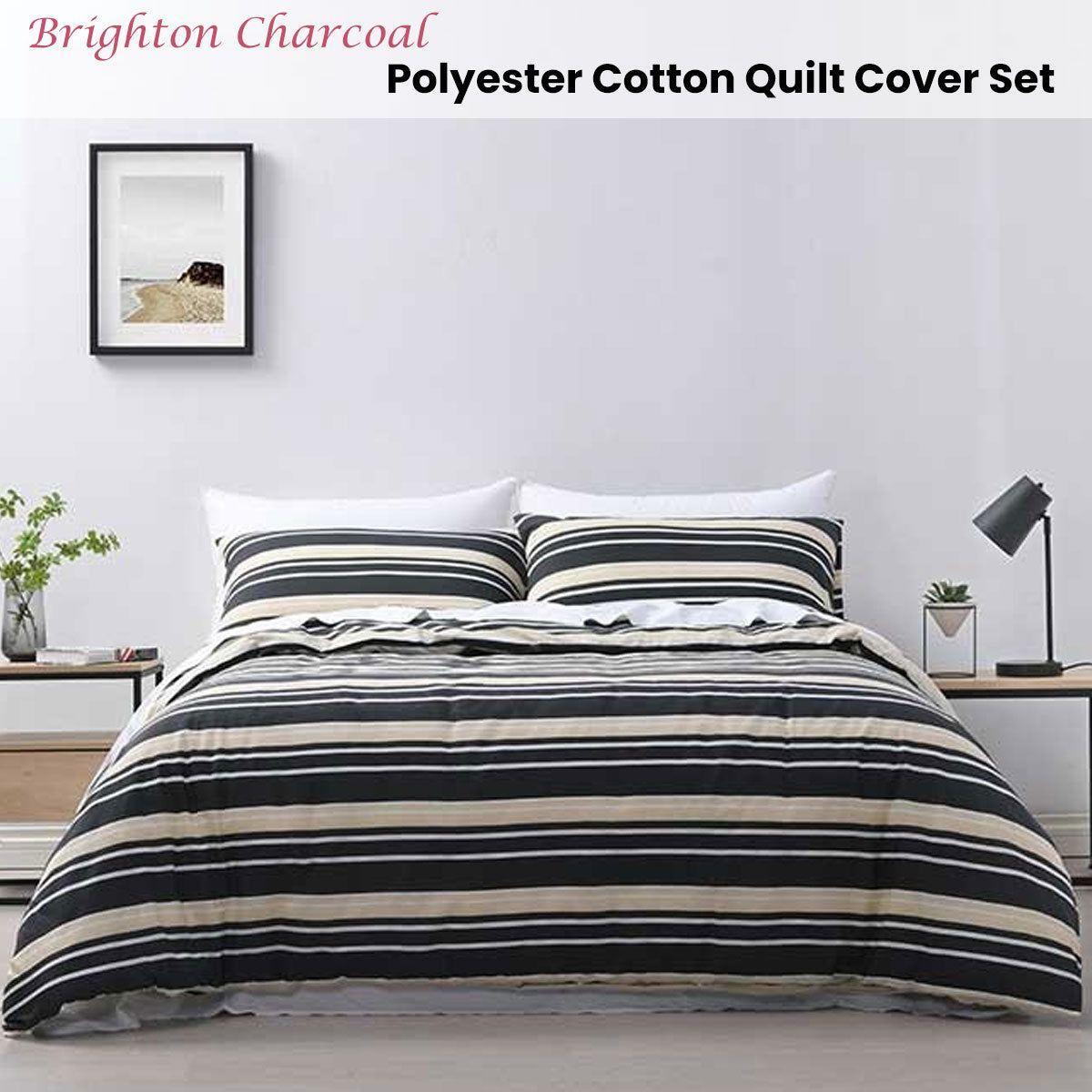 Indulge in luxury and comfort with Brighton Charcoal Quilt Cover Set by Jason. Printed 50%/50% Easy-Care Polyester/Cotton. Tonal diamond pattern. Press stud opening. Tailored Edge 1cm. Twin Needle Stitching. Designed to transform your sleeping experience into a peaceful retreat, this set combines contemporary style and comfort. Features stripes design printed in charcoal, white, and taupe.
