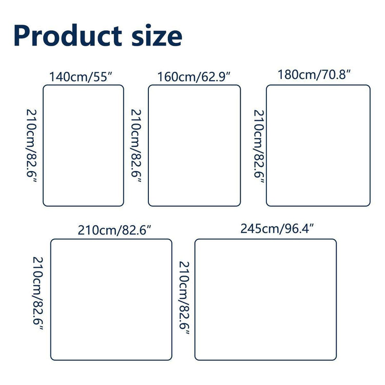 • Queen: 210 x 210 cm
