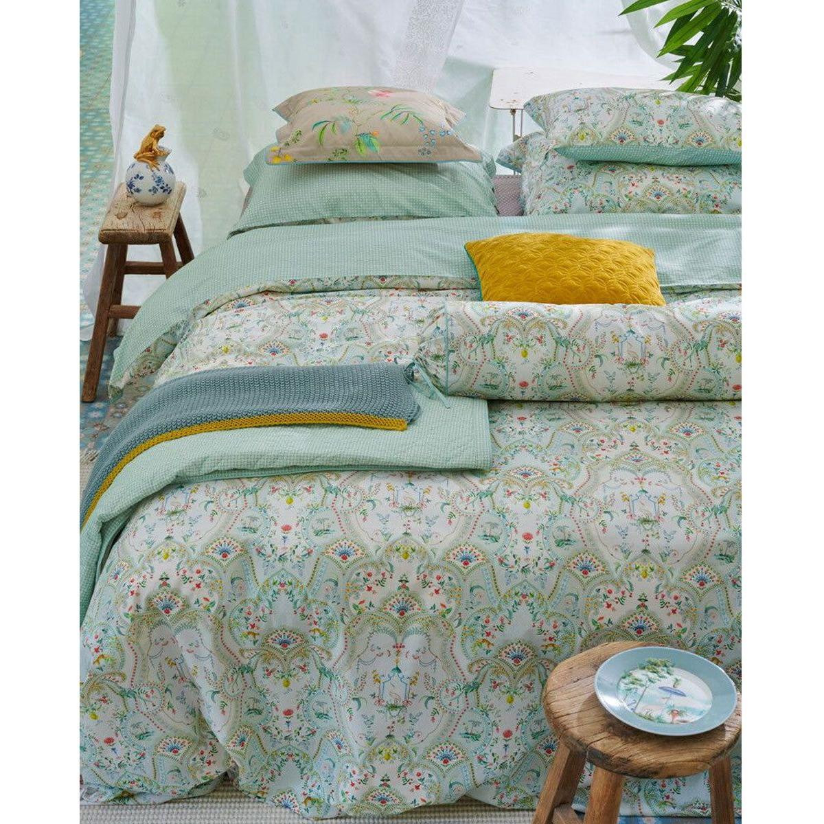 With an opulent print, there's something new to discover each time you look at this Curious Animals White Cotton Quilt Cover Set by PIP Studio. Featuring a highly stylised paisley print with tiny palm trees, ferns, and flowers printed in white, teal, green, red, yellow, pink, orange, brown, and black colour hues. Hidden among the foliage are small animals, including a heron, a leopard, and various birds. The back of the quilt cover and the pillowcases feature a detailed geometric tile pattern. The pillowcases and the quilt cover have an Oxford trim, coloured flat piping along the sides, The pillowcases have a unique tie closure. This makes it reversible, which creates a lovely mix-and-match effect on your bed. The quilt cover is made of 100% cotton. Percale cotton is a luxurious material that feels even softer and more pleasant than regular cotton due to the use of finer yarn and a higher number of threads. Due to the high weave density, percale cotton bedding is also extra sturdy and stays beautiful for a long time.
