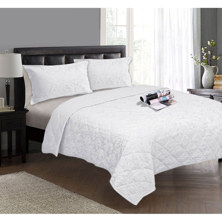 Keep warmth and comfortable all year round with this 3 Piece Jacquard Floral Comforter Set White by Ramesses. Features quilted floral design and lattice pattern in light colour tone that will add a touch of style and elegance. Approx 283gsm, convex, strong stereo sense, breathable, fit for all seasons, soft hand feeling. Made from soft touch Polyester fabric with easy care properties.