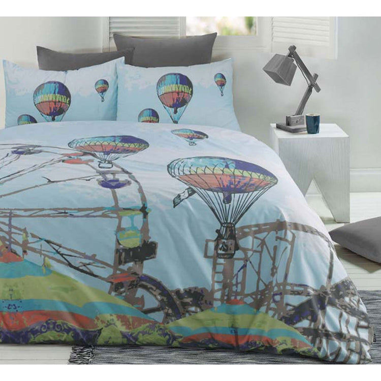 Make your bedroom the heart of the funfair with this Quilt Cover Set Carnival by Retro Home. It features a carnival print design that depicts the fun and festivity of the funfair accentuated with hot air balloon and Ferris wheel design and made from Polyester Cotton. Printed in shades of blue, white, brown, green, grey, navy, charcoal, and red.