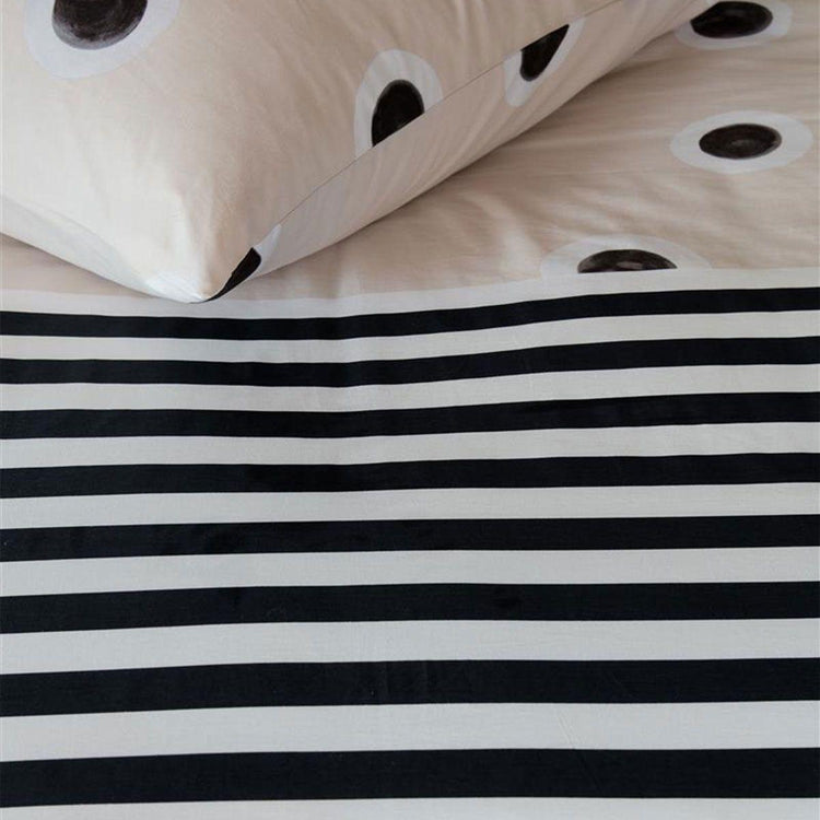The Stripe and Eye Natural Cotton Quilt Cover Set by VTWonen has a print of dots and stripes. The top of the quilt cover features a print of hand-painted natural, black and white dots against a cream-coloured background. The underside of the duvet cover features print of horizontal black and white stripes. The front and back of the quilt cover are identical.