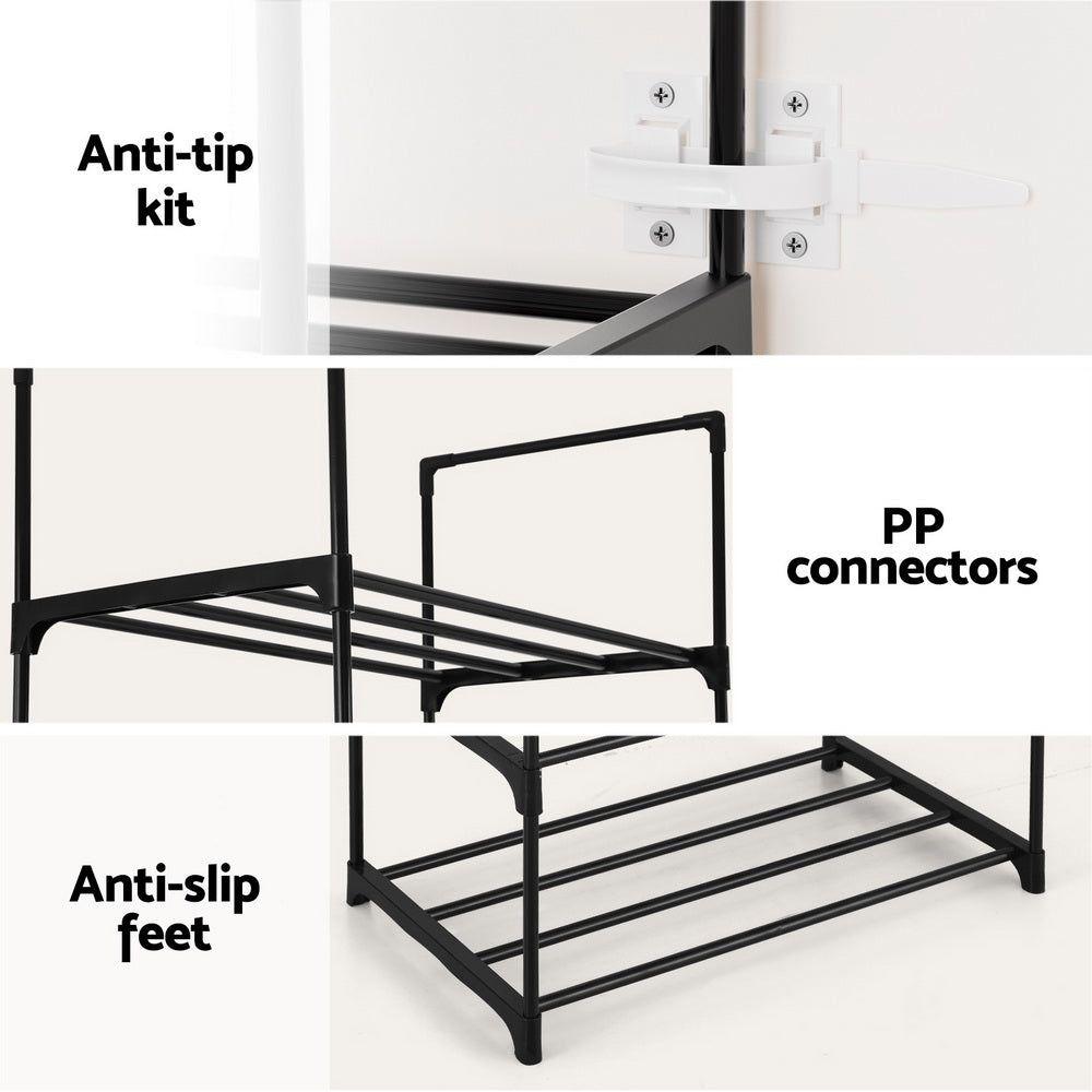 As your shoe collection grows, so should your shoe storage. An Artiss Dunn Shoe Rack is exactly what you need to keep loose shoes tidy and organised. Made from durable plastic connectors and a strong powder-coated metal frame, this multipurpose storage cabinet has a 5kg weight capacity per shelf, making it ideal for up to 20 pairs of shoes as well as bags, coats or other items to help start your day. The rack allows for easy ventilation, preventing bacteria growth, mould growth, and odours. The rack can be constructed in multiple different configurations to suit your needs, and shelves can be easily added or removed to store differently-sized shoes. You can even expand your shoe cabinet to fit your current storage requirements: simply visit our store and purchase additional units to multiply and expand. Best of all, the rack doesn’t require any tools to build: simply connect and go. With so many options at your disposal, it’s easy to see why the Artiss Dunn Shoe Rack is the right choice for your entryway, bedroom, or walk-in wardrobe.