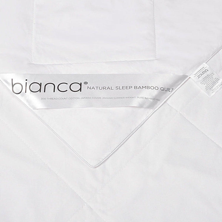 The 250GSM Natural Sleep Bamboo Summer Quilt by Bianca contains 250gsm of pure bamboo fill and is encased in a luxurious cotton japara cover. It features a diamond quilting pattern and is finished with a satin piped edge. This quilt is durable, breathable, retains loft and is sure to keep you cool in summer. An easy-care quilt that is machine washable and comes with a 10 year warranty against workmanship and faulty materials.