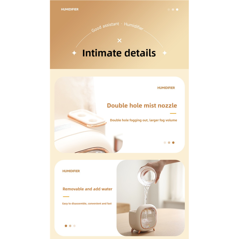 Experience premium air hydration with our USB-powered dual mist humidifier, designed with a charming cute pet theme. Ideal for bedrooms, offices, and small spaces, this aromatherapy machine combines functionality and aesthetics for the ultimate indoor air experience.